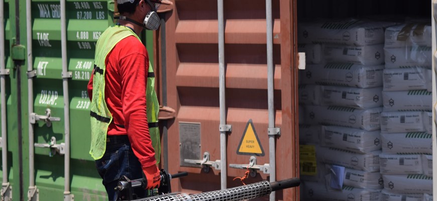 Tratamiento de un producto dentro de un contenedor de envío o del contenedor mismo para eliminar el riesgo de que plagas o enfermedades entren o salgan del país o estado.